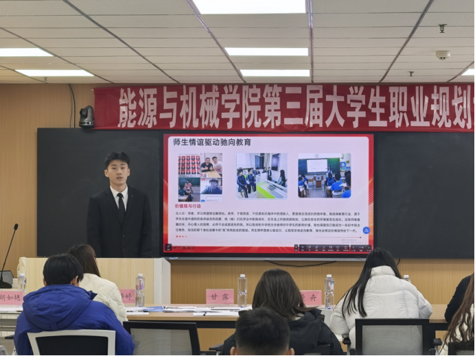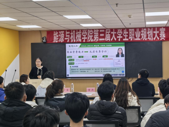 科学规划引领成长,主题陈述精彩纷呈。大赛严格按照校级和全国大赛要求开展,参赛选手需提交《生涯发展报告》及展示PPT,并在现场进行“主题陈述—评委提问”两个环节的比拼,重点考察规划科学性、实践行动力和现场表达等综合能力。现场比赛中,选手们围绕个人兴趣、专业优势与行业趋势展开深入分析,不仅展示了对能源、机械、物联网、新材料等领域的专业理解,也展现了青年学生积极拥抱国家战略需求、主动融入经济社会发展的责任担当。