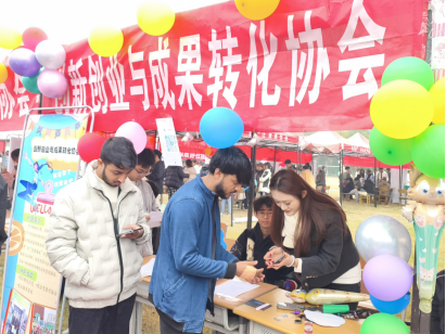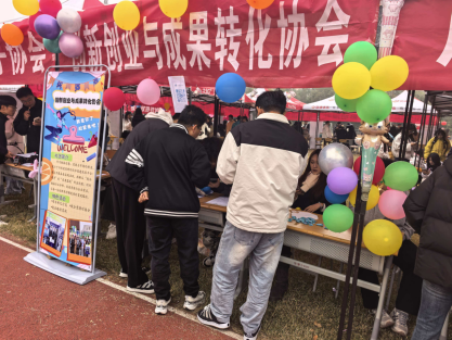 在创新创业与成果转化协会的招新现场,红色的协会横幅醒目亮眼,五彩斑斓的气球将摊位装扮得活力四射。协会成员耐心介绍社团简介及培训内容,帮助同学们更好的了解社团情况。招新现场还吸引了来自不同国家的学生,社团工作人员正耐心且热情地向外国同学介绍社团的创新创业项目成果,他对此十分感兴趣并表示非常乐意加入我们。