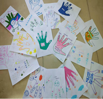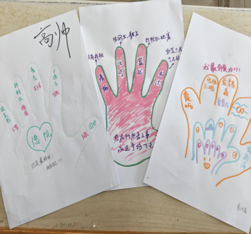 活动分为两个环节,环节亮点纷呈、暖意十足。首个环节“闹钟炸弹”环节互动感拉满,同学依次传递“炸弹”,主持人敲击声终止,“炸弹”持有者,需要回答问题,现场笑声不断,充分调动大家的参与热情。随后环节是“独一无二的手掌”充满治愈感,同学们在纸上画出手掌,写下自己的优点,再用画笔装饰,把正能量转化为视觉作品。分享环节中,同学们主动展示“优点手掌”,定格专属温暖印记。