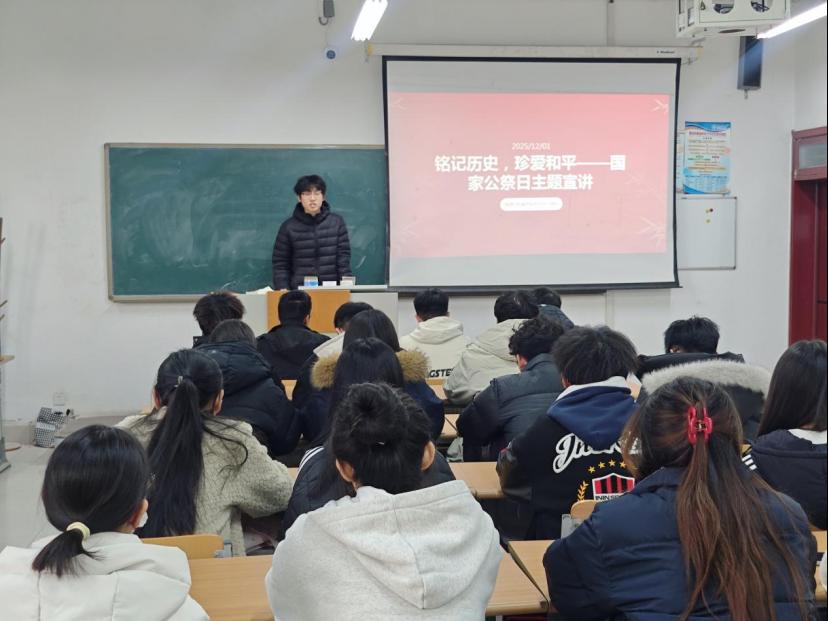 随后,学生代表王晨维结合精心制作的PPT开展公祭日宣讲,通过详实资料与震撼图片,回溯南京大屠杀的惨痛历史,讲述革命先烈浴血抗争的事迹,阐释国家公祭日设立的意义,让在场学子深刻体会“落后就要挨打”的教训,坚定珍爱和平、砥砺自强的决心。