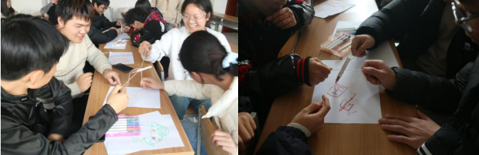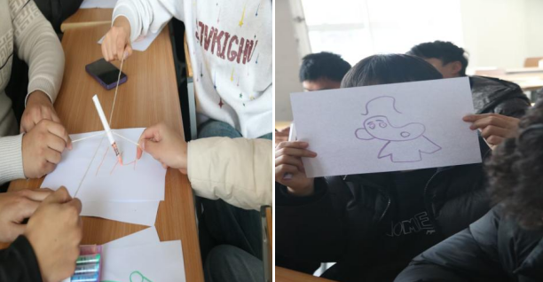 活动开始,主持人首先介绍了流程与规则:3-5人一组将笔用绳子绑起,每人牵动绳子共同作画。原本独立的画笔,在多人配合下逐渐形成独特的图案,各组展示作品时,“奇思妙想”的画作背后,同学们完成了从“各自发力”到“默契配合”的过程。