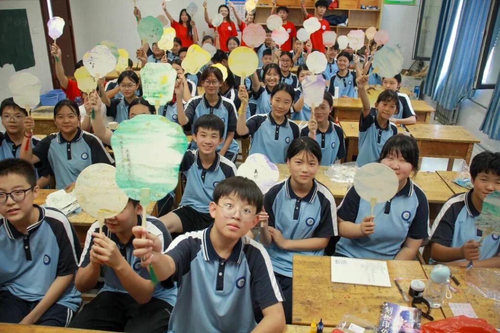 “老师,您看我画的牡丹扇面!”“我的扎染手帕像星空一样!”非遗传承课堂上,中学生们举着亲手完成的作品雀跃不已。志愿者们化身传统文化传播者,细致讲解漆扇绘制的笔法韵律与扎染工艺的千年传承,手把手指导学生在素扇上勾勒纹样,在蓝白浸染中感受“扎缬”技艺的随机之美。当孩子们触摸着自己创作的漆扇纹理、展开独一无二的扎染布料时,非遗文化不再是课本里的文字,而是指尖可触的温度、心中可感的文化自信。这一堂堂“活态传承”课,让青少年在实践中读懂非遗背后的匠心与文脉。