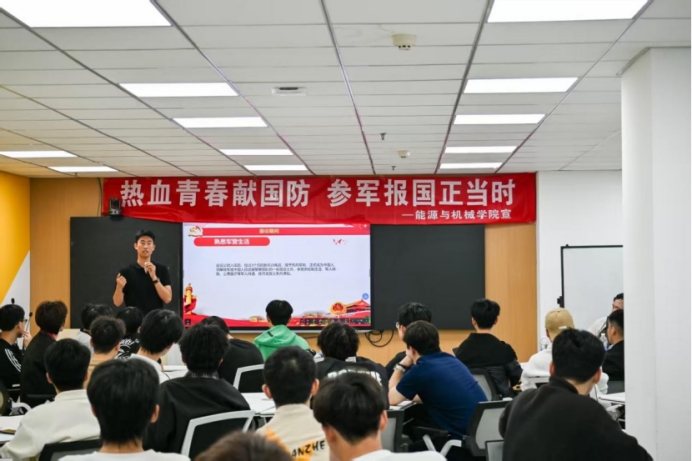 宣讲现场,两位退伍士兵结合自身经历,围绕征兵政策、入伍条件、报名流程等核心内容展开详细讲解,重点解读了大学生入伍在升学、就业等方面的专属优待政策。结合能源与机械学院专业特色,两人深入分析了青年学子参军入伍的职业发展路径,明确军营历练对提升个人综合素质、增强就业竞争力的重要意义,鼓励同学们把握时代机遇,以青春热血践行报国初心。