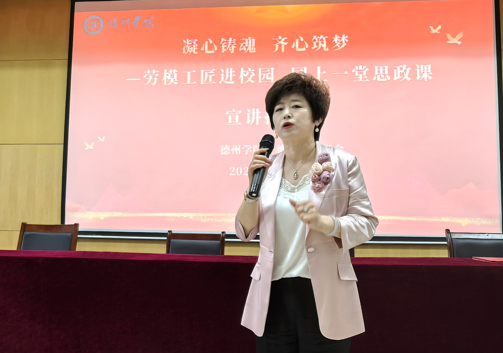 引导师生树立正确的劳动观与职业观,5月20日,学校邀请全国劳模、省劳模工匠宣讲团成员、德百集团百货大楼客户部经理杨秀娟来校宣讲。